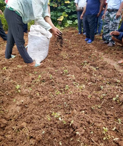 來到田間陽光豐盛,剛翻新的土地上,散落著零星野草,陽光一照便散發出泥土的芬芳,皮膚黝黑的農人喜氣洋洋,熱情的歡迎著我們的到來,趙經理立馬接過鋤頭,親自示范,動作行云流暢,十分嫻熟,他根據山地的走勢,選擇出開廂方向,很快就平好一廂地。他蹲在濕潤的土地上,鞋上沾滿了自然的饋贈,真是十分接地氣!很快,他就在平好的土地上刨出間距20~25cm的小坑,一邊行動一邊講解,一氣呵成,一套動作下來,便已經大汗淋漓了,村民們已經備好了上好且成熟的農家肥,“每個小坑播種3到5顆種子,在這之前可以先施肥,但是要刨土稍微覆蓋一下,避免發酵灼燒了種子,接下來播種3到5粒,再將土完全覆蓋,種子出芽的這段時間必須注重田間除草,眾所周知野草頑強的生命和驚人的長勢,前期必定會蓋過木香出苗,這段時間尤為重要,如果發現有的小坑少出或不出,就將多出的進行移栽,此方法可保證日后的產出……”事無巨細,娓娓道來。最后便以“做過農民的都應該知道!”為總結。村民們豁然開朗,紛紛表示一定沒有問題,于是躍躍欲試,紛紛提出親自勞動,果然立馬上手!