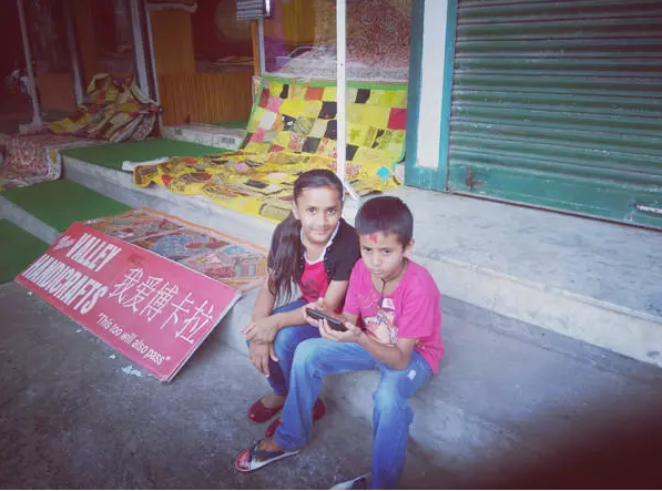 那天,我們仨帶著Lybia和八歲的Lishan走在費瓦湖邊小路上,遇見了湖邊未曾見過的小吃攤,我們很有興致,停了下來,買了當?shù)啬欠N油炸的外殼,里邊塞滿了蔬菜或者肉的食物。同伴說:“第一次吃吃這個,我們還是一起拍個照吧!”于是,有了合影。
